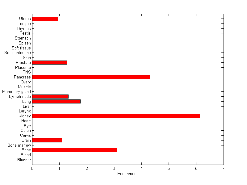 The expression level is normalized with tissue-library size. Each value for a gene in a tissue is a ratio of observed ESTs to the expected one in this tissue. The expected number of ESTs is the product of total ESTs of the gene and the fraction of total ESTs in the tissue among all ESTs in 30 tissues.