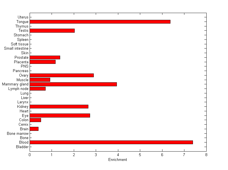 The expression level is normalized with tissue-library size. Each value for a gene in a tissue is a ratio of observed ESTs to the expected one in this tissue. The expected number of ESTs is the product of total ESTs of the gene and the fraction of total ESTs in the tissue among all ESTs in 30 tissues.