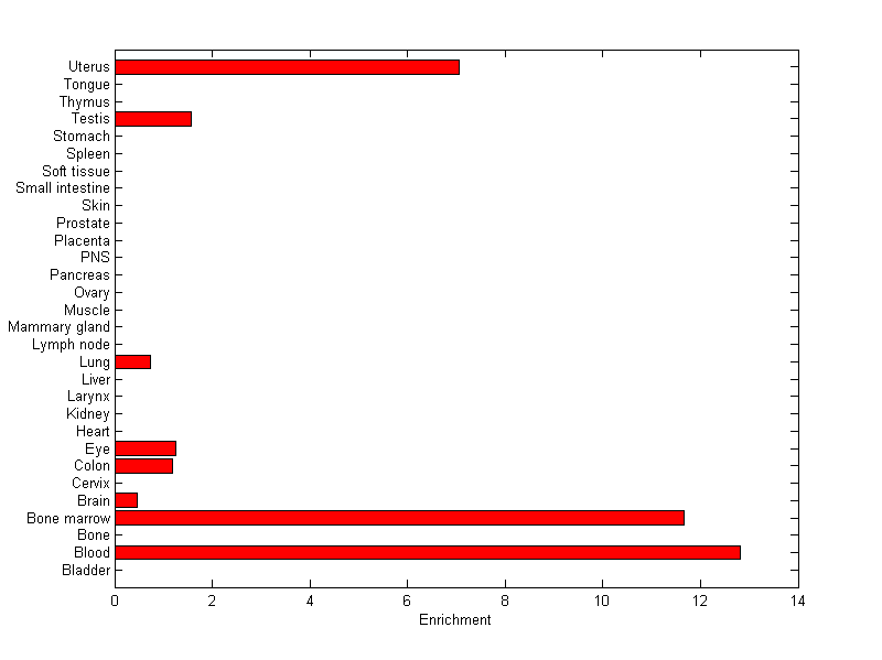 The expression level is normalized with tissue-library size. Each value for a gene in a tissue is a ratio of observed ESTs to the expected one in this tissue. The expected number of ESTs is the product of total ESTs of the gene and the fraction of total ESTs in the tissue among all ESTs in 30 tissues.