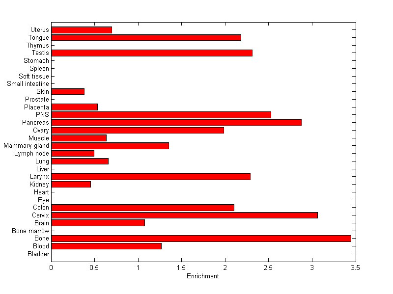 The expression level is normalized with tissue-library size. Each value for a gene in a tissue is a ratio of observed ESTs to the expected one in this tissue. The expected number of ESTs is the product of total ESTs of the gene and the fraction of total ESTs in the tissue among all ESTs in 30 tissues.