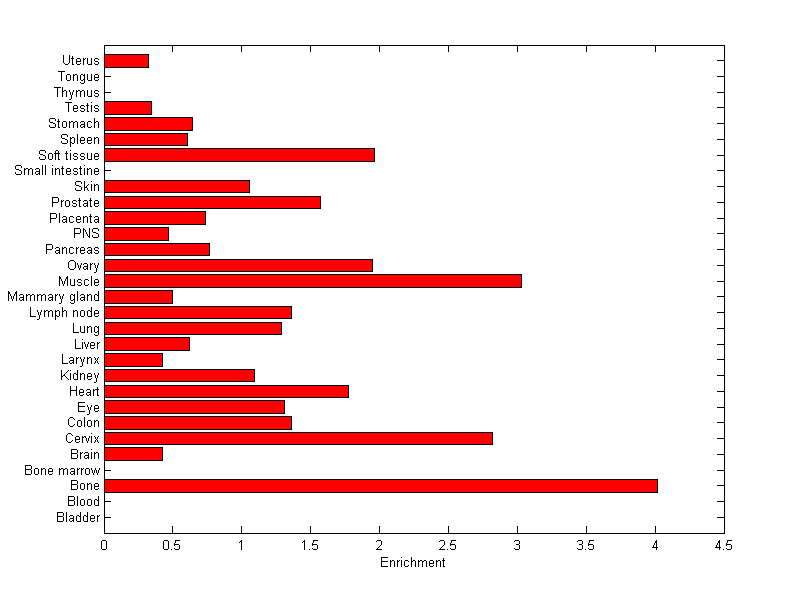 The expression level is normalized with tissue-library size. Each value for a gene in a tissue is a ratio of observed ESTs to the expected one in this tissue. The expected number of ESTs is the product of total ESTs of the gene and the fraction of total ESTs in the tissue among all ESTs in 30 tissues.