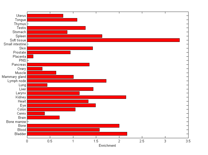 The expression level is normalized with tissue-library size. Each value for a gene in a tissue is a ratio of observed ESTs to the expected one in this tissue. The expected number of ESTs is the product of total ESTs of the gene and the fraction of total ESTs in the tissue among all ESTs in 30 tissues.