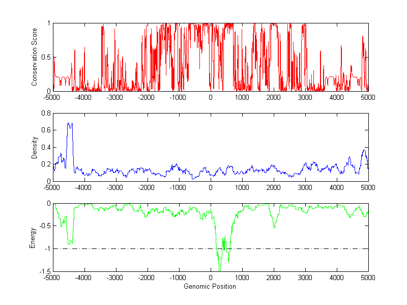 The energy profile (green curve) is about energy for module detection based on TF interaction. The positions with energy less than -1 indicate the existence of CRMs.