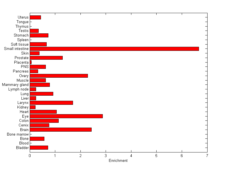 The expression level is normalized with tissue-library size. Each value for a gene in a tissue is a ratio of observed ESTs to the expected one in this tissue. The expected number of ESTs is the product of total ESTs of the gene and the fraction of total ESTs in the tissue among all ESTs in 30 tissues.