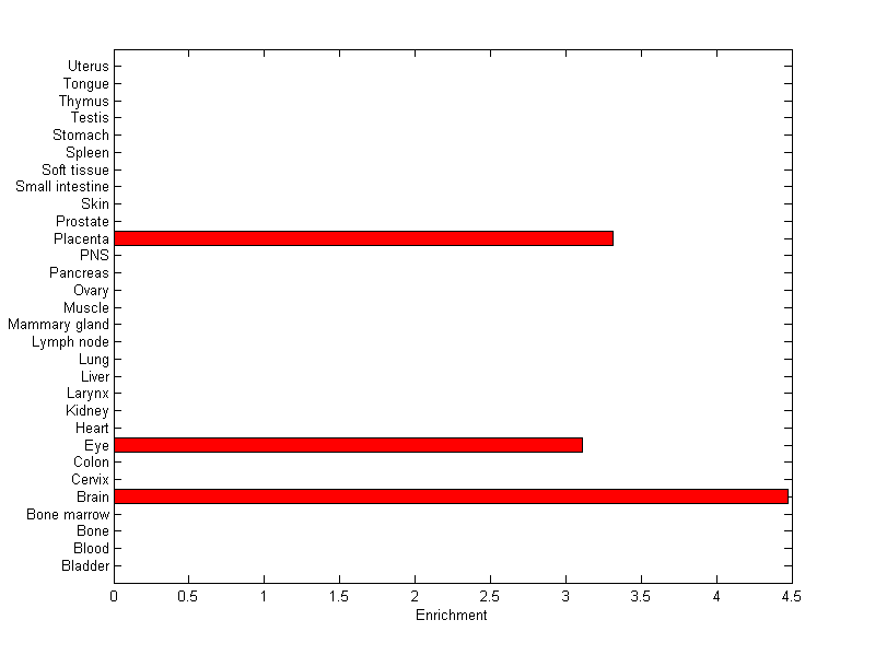 The expression level is normalized with tissue-library size. Each value for a gene in a tissue is a ratio of observed ESTs to the expected one in this tissue. The expected number of ESTs is the product of total ESTs of the gene and the fraction of total ESTs in the tissue among all ESTs in 30 tissues.