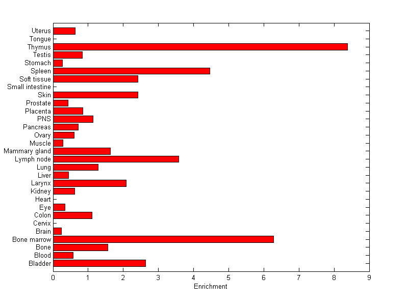 The expression level is normalized with tissue-library size. Each value for a gene in a tissue is a ratio of observed ESTs to the expected one in this tissue. The expected number of ESTs is the product of total ESTs of the gene and the fraction of total ESTs in the tissue among all ESTs in 30 tissues.