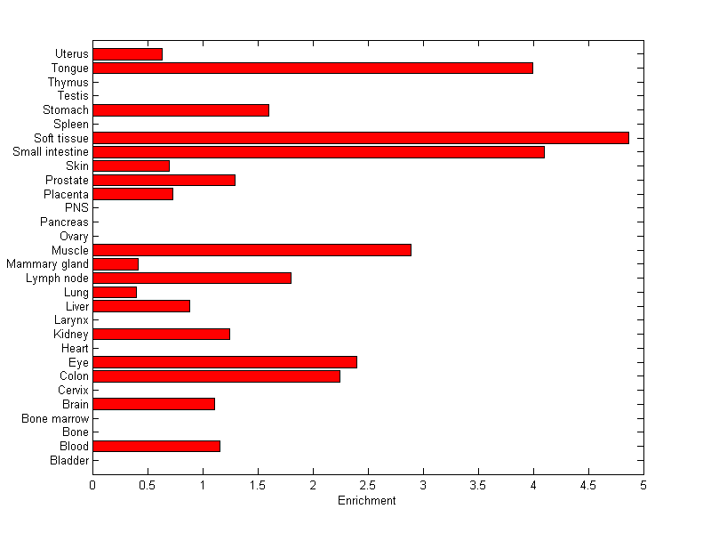 The expression level is normalized with tissue-library size. Each value for a gene in a tissue is a ratio of observed ESTs to the expected one in this tissue. The expected number of ESTs is the product of total ESTs of the gene and the fraction of total ESTs in the tissue among all ESTs in 30 tissues.