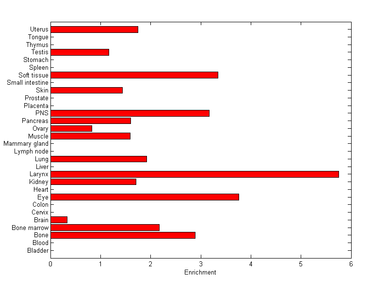 The expression level is normalized with tissue-library size. Each value for a gene in a tissue is a ratio of observed ESTs to the expected one in this tissue. The expected number of ESTs is the product of total ESTs of the gene and the fraction of total ESTs in the tissue among all ESTs in 30 tissues.