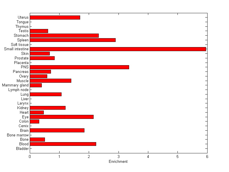 The expression level is normalized with tissue-library size. Each value for a gene in a tissue is a ratio of observed ESTs to the expected one in this tissue. The expected number of ESTs is the product of total ESTs of the gene and the fraction of total ESTs in the tissue among all ESTs in 30 tissues.