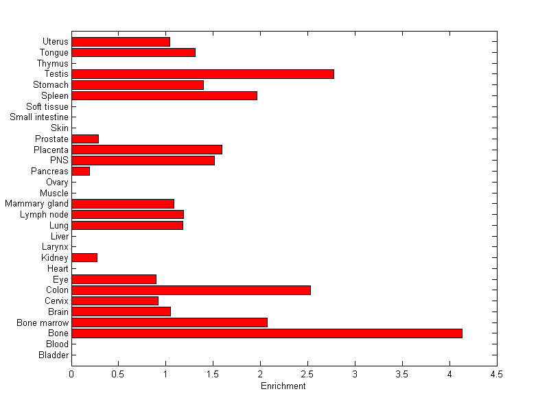The expression level is normalized with tissue-library size. Each value for a gene in a tissue is a ratio of observed ESTs to the expected one in this tissue. The expected number of ESTs is the product of total ESTs of the gene and the fraction of total ESTs in the tissue among all ESTs in 30 tissues.