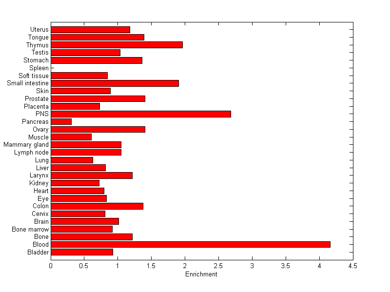 The expression level is normalized with tissue-library size. Each value for a gene in a tissue is a ratio of observed ESTs to the expected one in this tissue. The expected number of ESTs is the product of total ESTs of the gene and the fraction of total ESTs in the tissue among all ESTs in 30 tissues.