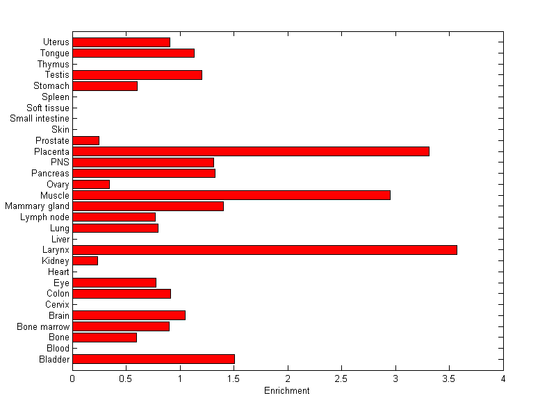 The expression level is normalized with tissue-library size. Each value for a gene in a tissue is a ratio of observed ESTs to the expected one in this tissue. The expected number of ESTs is the product of total ESTs of the gene and the fraction of total ESTs in the tissue among all ESTs in 30 tissues.