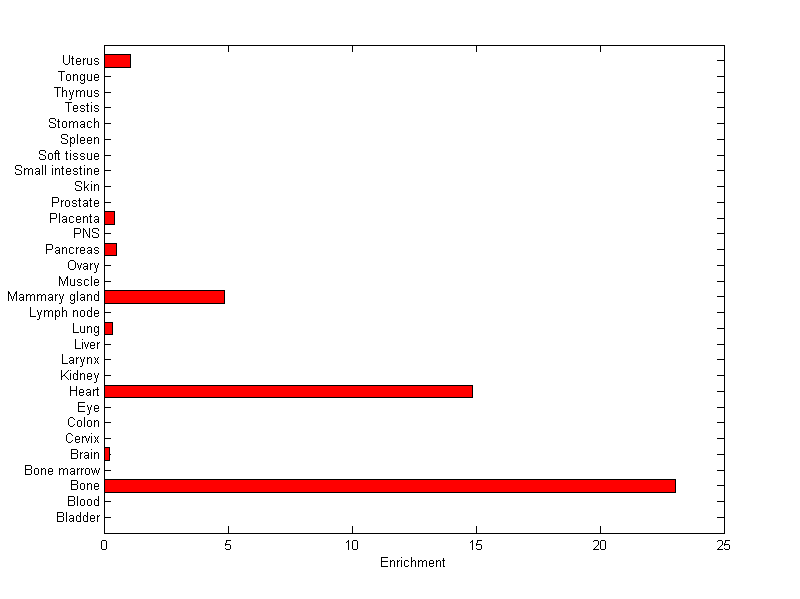 About the profile: The expression level is normalized with tissue-library size. Each value for a gene in a tissue is a ratio of observed ESTs to the expected one in this tissue. The expected number of ESTs is the product of total ESTs of the gene and the fraction of total ESTs in the tissue among all ESTs in 30 tissues. Summary: This gene is preferentially expressed in [bone, heart] Download: |