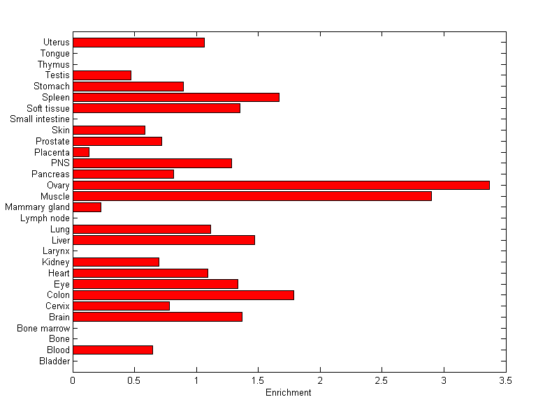 The expression level is normalized with tissue-library size. Each value for a gene in a tissue is a ratio of observed ESTs to the expected one in this tissue. The expected number of ESTs is the product of total ESTs of the gene and the fraction of total ESTs in the tissue among all ESTs in 30 tissues.