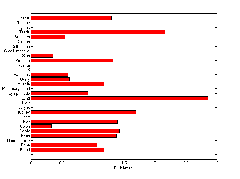 The expression level is normalized with tissue-library size. Each value for a gene in a tissue is a ratio of observed ESTs to the expected one in this tissue. The expected number of ESTs is the product of total ESTs of the gene and the fraction of total ESTs in the tissue among all ESTs in 30 tissues.