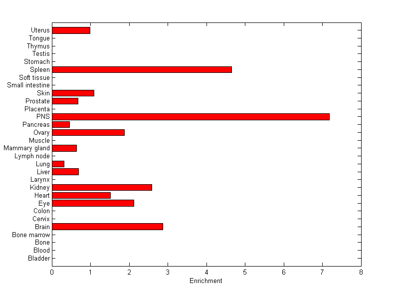 The expression level is normalized with tissue-library size. Each value for a gene in a tissue is a ratio of observed ESTs to the expected one in this tissue. The expected number of ESTs is the product of total ESTs of the gene and the fraction of total ESTs in the tissue among all ESTs in 30 tissues.