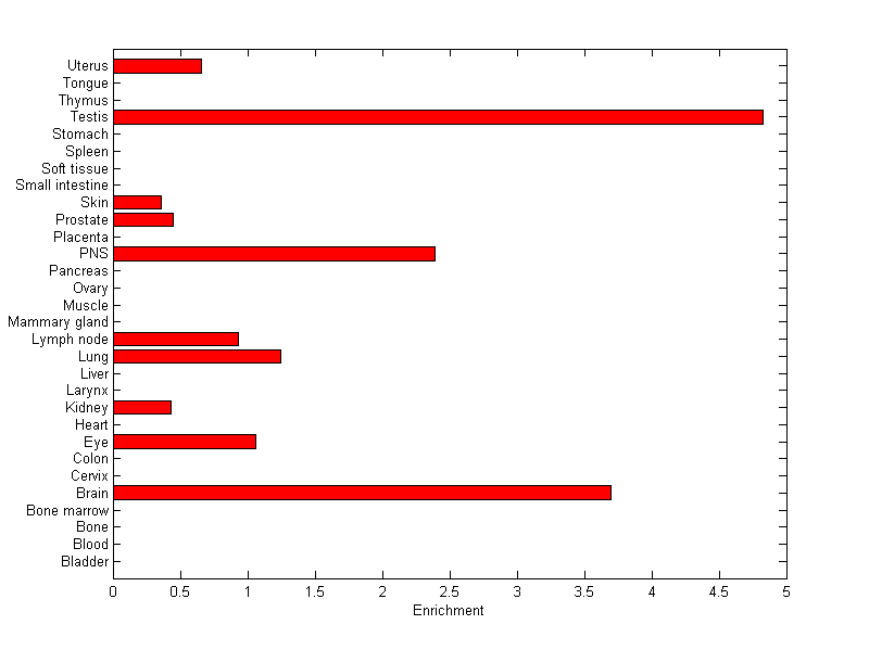 The expression level is normalized with tissue-library size. Each value for a gene in a tissue is a ratio of observed ESTs to the expected one in this tissue. The expected number of ESTs is the product of total ESTs of the gene and the fraction of total ESTs in the tissue among all ESTs in 30 tissues.