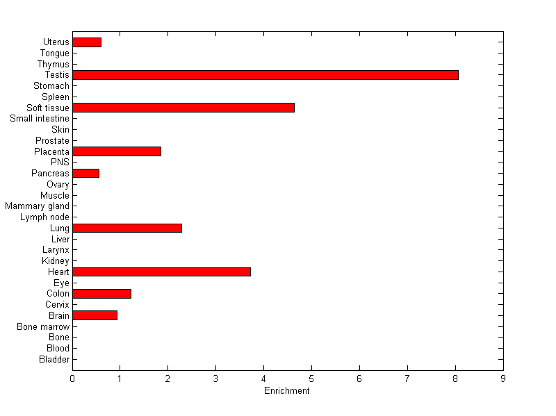 The expression level is normalized with tissue-library size. Each value for a gene in a tissue is a ratio of observed ESTs to the expected one in this tissue. The expected number of ESTs is the product of total ESTs of the gene and the fraction of total ESTs in the tissue among all ESTs in 30 tissues.