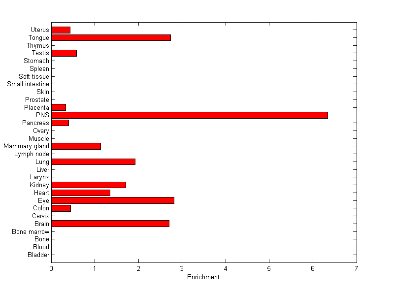 The expression level is normalized with tissue-library size. Each value for a gene in a tissue is a ratio of observed ESTs to the expected one in this tissue. The expected number of ESTs is the product of total ESTs of the gene and the fraction of total ESTs in the tissue among all ESTs in 30 tissues.