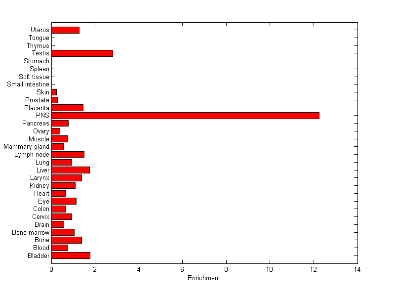 The expression level is normalized with tissue-library size. Each value for a gene in a tissue is a ratio of observed ESTs to the expected one in this tissue. The expected number of ESTs is the product of total ESTs of the gene and the fraction of total ESTs in the tissue among all ESTs in 30 tissues.