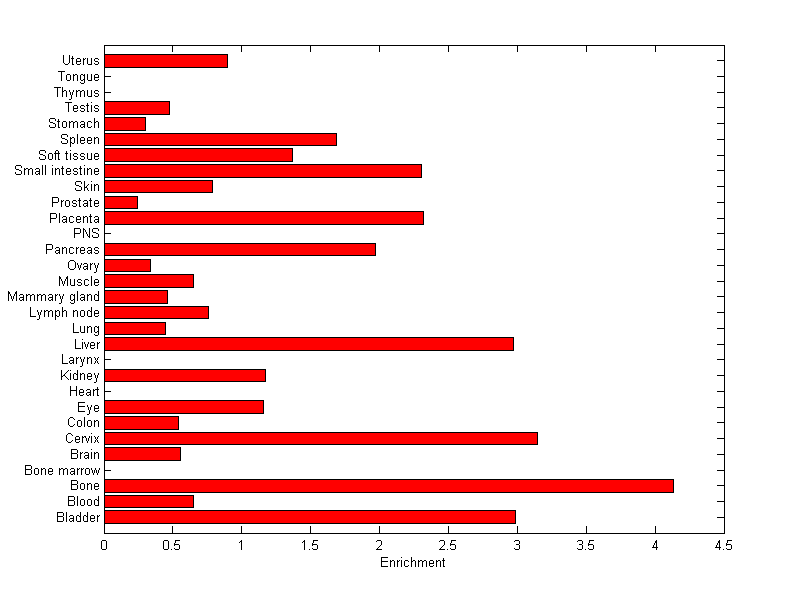 The expression level is normalized with tissue-library size. Each value for a gene in a tissue is a ratio of observed ESTs to the expected one in this tissue. The expected number of ESTs is the product of total ESTs of the gene and the fraction of total ESTs in the tissue among all ESTs in 30 tissues.