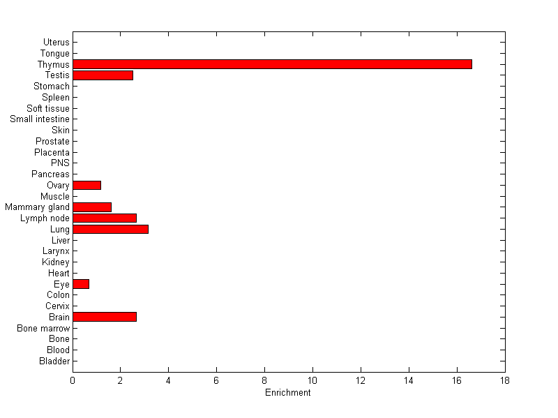 The expression level is normalized with tissue-library size. Each value for a gene in a tissue is a ratio of observed ESTs to the expected one in this tissue. The expected number of ESTs is the product of total ESTs of the gene and the fraction of total ESTs in the tissue among all ESTs in 30 tissues.