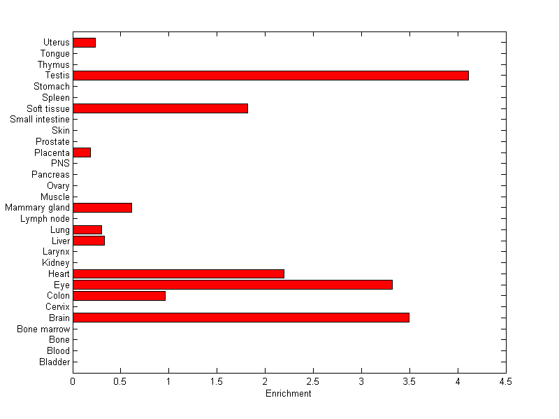 The expression level is normalized with tissue-library size. Each value for a gene in a tissue is a ratio of observed ESTs to the expected one in this tissue. The expected number of ESTs is the product of total ESTs of the gene and the fraction of total ESTs in the tissue among all ESTs in 30 tissues.