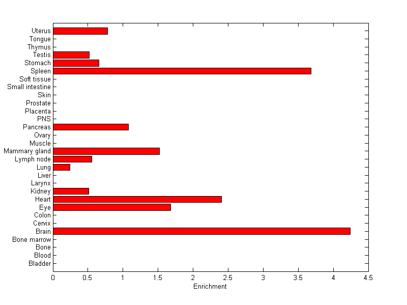 The expression level is normalized with tissue-library size. Each value for a gene in a tissue is a ratio of observed ESTs to the expected one in this tissue. The expected number of ESTs is the product of total ESTs of the gene and the fraction of total ESTs in the tissue among all ESTs in 30 tissues.