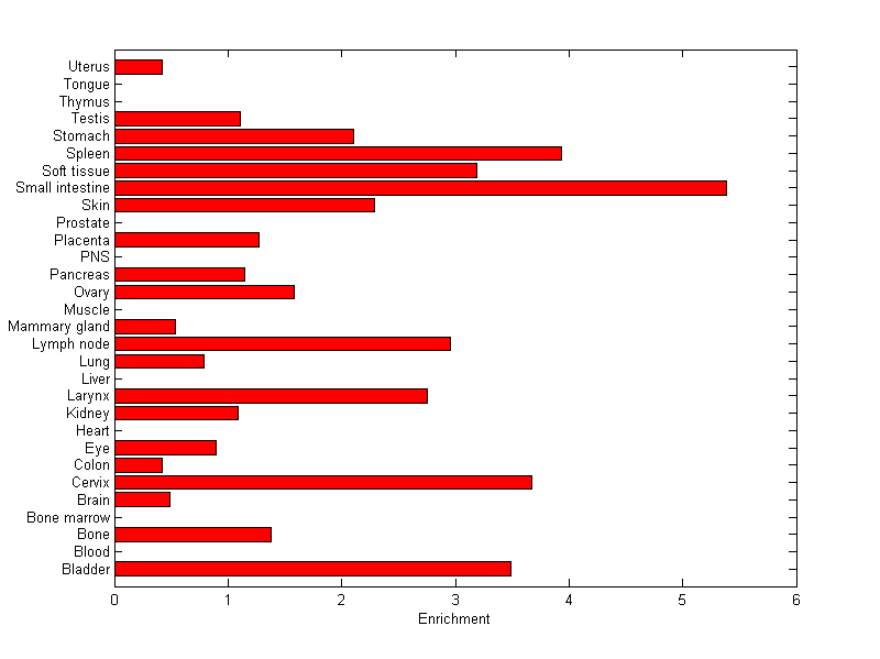 The expression level is normalized with tissue-library size. Each value for a gene in a tissue is a ratio of observed ESTs to the expected one in this tissue. The expected number of ESTs is the product of total ESTs of the gene and the fraction of total ESTs in the tissue among all ESTs in 30 tissues.