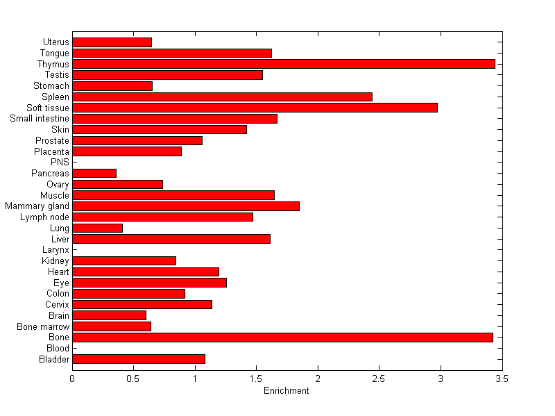 The expression level is normalized with tissue-library size. Each value for a gene in a tissue is a ratio of observed ESTs to the expected one in this tissue. The expected number of ESTs is the product of total ESTs of the gene and the fraction of total ESTs in the tissue among all ESTs in 30 tissues.