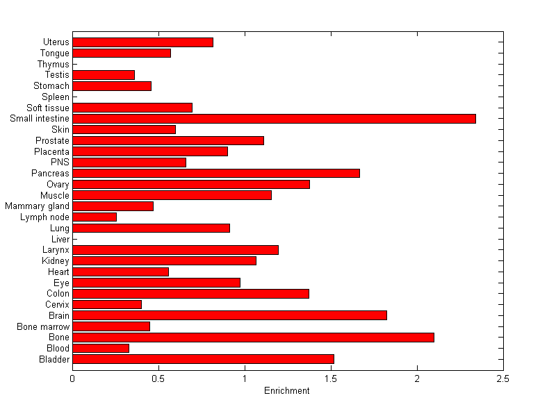 The expression level is normalized with tissue-library size. Each value for a gene in a tissue is a ratio of observed ESTs to the expected one in this tissue. The expected number of ESTs is the product of total ESTs of the gene and the fraction of total ESTs in the tissue among all ESTs in 30 tissues.