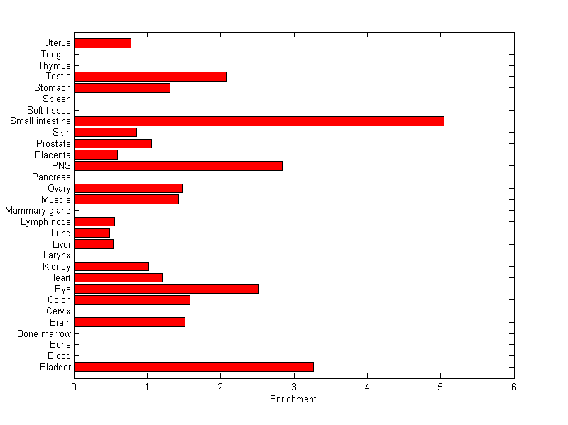 The expression level is normalized with tissue-library size. Each value for a gene in a tissue is a ratio of observed ESTs to the expected one in this tissue. The expected number of ESTs is the product of total ESTs of the gene and the fraction of total ESTs in the tissue among all ESTs in 30 tissues.
