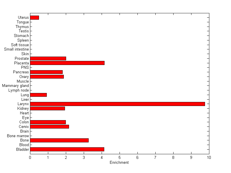 The expression level is normalized with tissue-library size. Each value for a gene in a tissue is a ratio of observed ESTs to the expected one in this tissue. The expected number of ESTs is the product of total ESTs of the gene and the fraction of total ESTs in the tissue among all ESTs in 30 tissues.