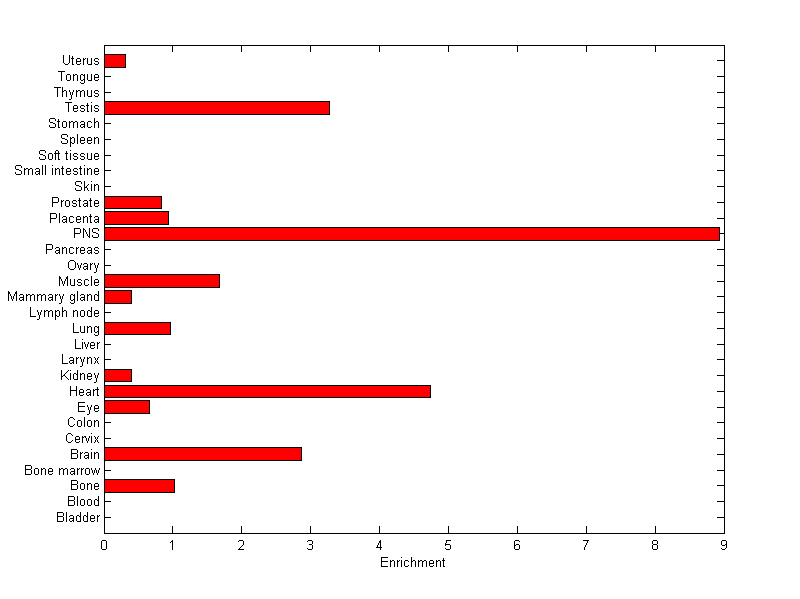 The expression level is normalized with tissue-library size. Each value for a gene in a tissue is a ratio of observed ESTs to the expected one in this tissue. The expected number of ESTs is the product of total ESTs of the gene and the fraction of total ESTs in the tissue among all ESTs in 30 tissues.