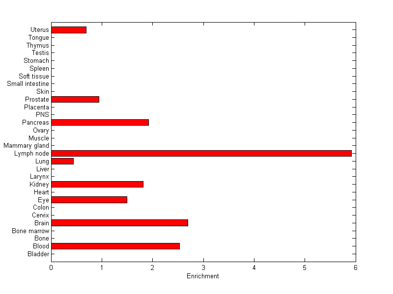 The expression level is normalized with tissue-library size. Each value for a gene in a tissue is a ratio of observed ESTs to the expected one in this tissue. The expected number of ESTs is the product of total ESTs of the gene and the fraction of total ESTs in the tissue among all ESTs in 30 tissues.