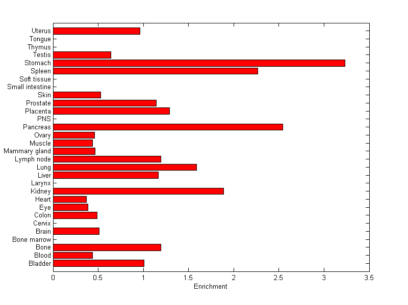 The expression level is normalized with tissue-library size. Each value for a gene in a tissue is a ratio of observed ESTs to the expected one in this tissue. The expected number of ESTs is the product of total ESTs of the gene and the fraction of total ESTs in the tissue among all ESTs in 30 tissues.