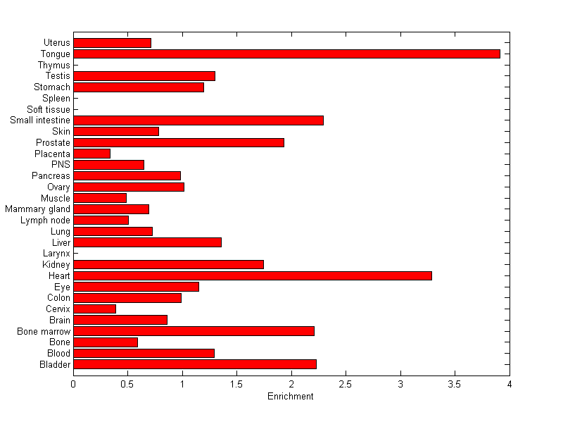 The expression level is normalized with tissue-library size. Each value for a gene in a tissue is a ratio of observed ESTs to the expected one in this tissue. The expected number of ESTs is the product of total ESTs of the gene and the fraction of total ESTs in the tissue among all ESTs in 30 tissues.