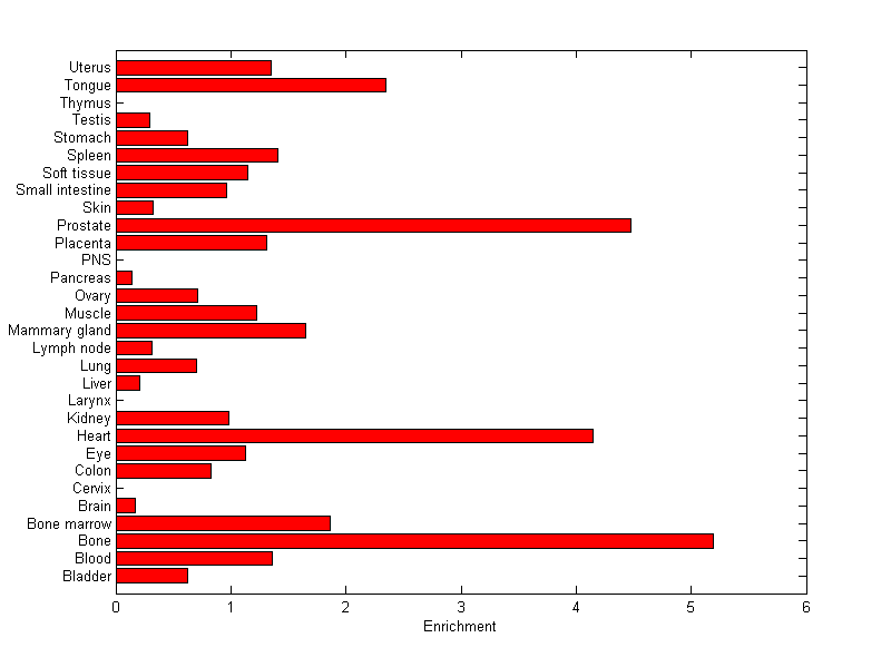 The expression level is normalized with tissue-library size. Each value for a gene in a tissue is a ratio of observed ESTs to the expected one in this tissue. The expected number of ESTs is the product of total ESTs of the gene and the fraction of total ESTs in the tissue among all ESTs in 30 tissues.