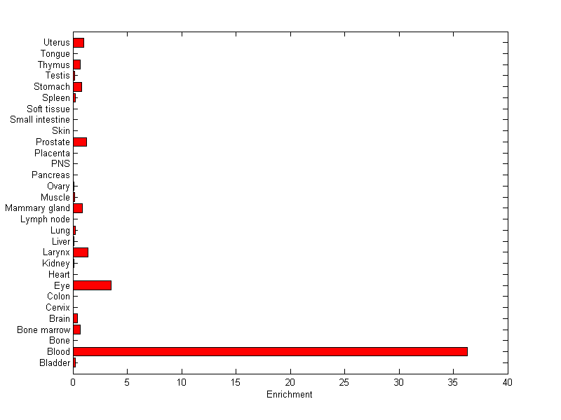 The expression level is normalized with tissue-library size. Each value for a gene in a tissue is a ratio of observed ESTs to the expected one in this tissue. The expected number of ESTs is the product of total ESTs of the gene and the fraction of total ESTs in the tissue among all ESTs in 30 tissues.
