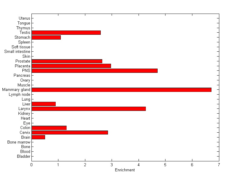 About the profile: The expression level is normalized with tissue-library size. Each value for a gene in a tissue is a ratio of observed ESTs to the expected one in this tissue. The expected number of ESTs is the product of total ESTs of the gene and the fraction of total ESTs in the tissue among all ESTs in 30 tissues. Summary: This gene is preferentially expressed in [mammary_gland] Download: |