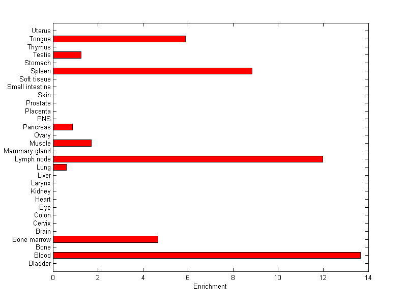 The expression level is normalized with tissue-library size. Each value for a gene in a tissue is a ratio of observed ESTs to the expected one in this tissue. The expected number of ESTs is the product of total ESTs of the gene and the fraction of total ESTs in the tissue among all ESTs in 30 tissues.