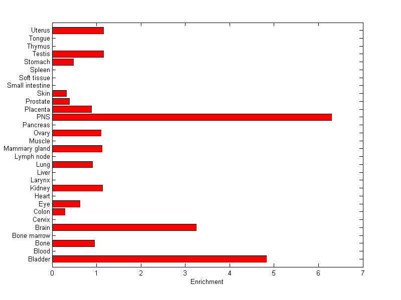 The expression level is normalized with tissue-library size. Each value for a gene in a tissue is a ratio of observed ESTs to the expected one in this tissue. The expected number of ESTs is the product of total ESTs of the gene and the fraction of total ESTs in the tissue among all ESTs in 30 tissues.