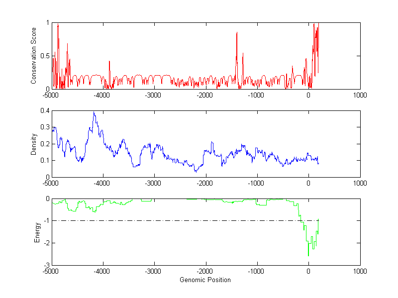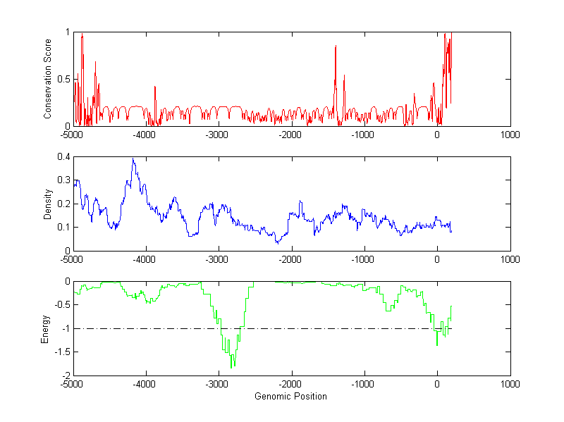 The energy profile (green curve) is about energy for module detection based on TF interaction. The positions with energy less than -1 indicate the existence of CRMs.