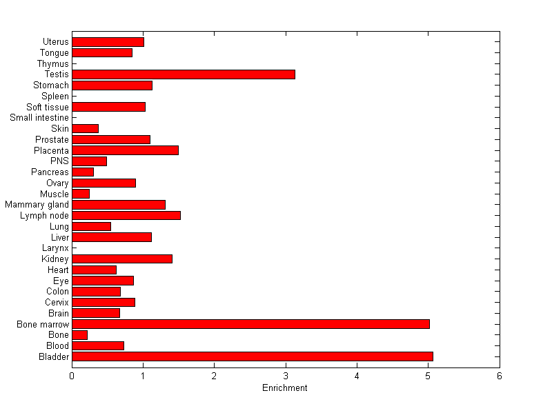 The expression level is normalized with tissue-library size. Each value for a gene in a tissue is a ratio of observed ESTs to the expected one in this tissue. The expected number of ESTs is the product of total ESTs of the gene and the fraction of total ESTs in the tissue among all ESTs in 30 tissues.