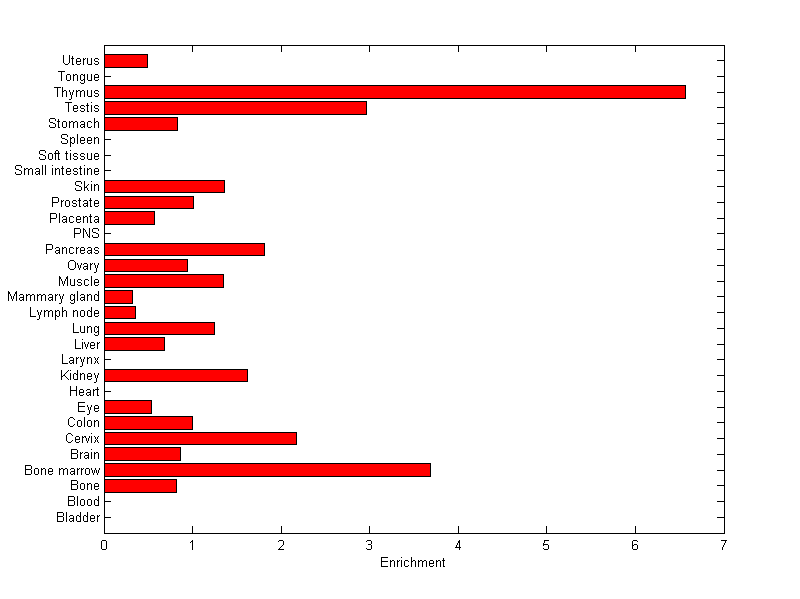 The expression level is normalized with tissue-library size. Each value for a gene in a tissue is a ratio of observed ESTs to the expected one in this tissue. The expected number of ESTs is the product of total ESTs of the gene and the fraction of total ESTs in the tissue among all ESTs in 30 tissues.