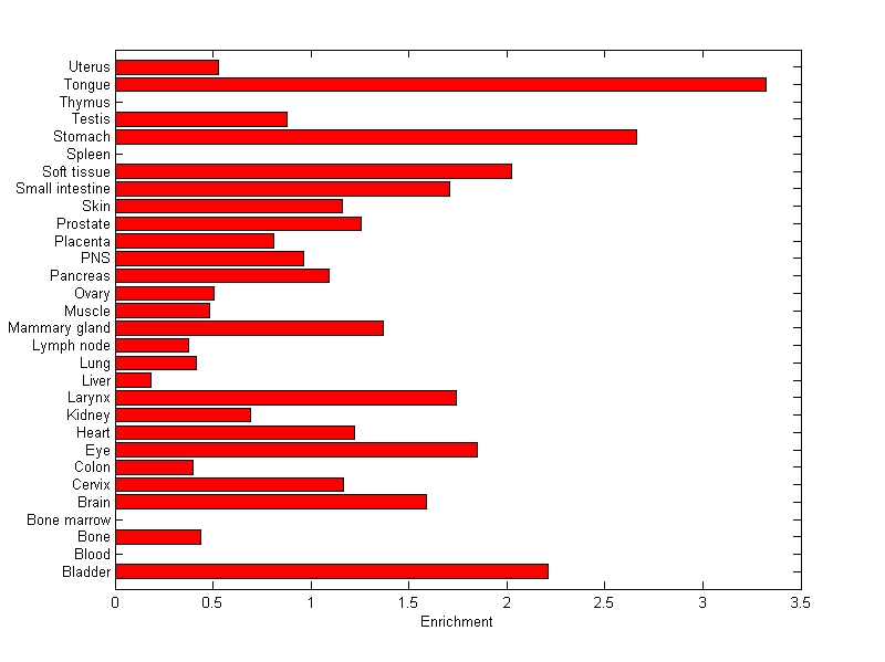 The expression level is normalized with tissue-library size. Each value for a gene in a tissue is a ratio of observed ESTs to the expected one in this tissue. The expected number of ESTs is the product of total ESTs of the gene and the fraction of total ESTs in the tissue among all ESTs in 30 tissues.