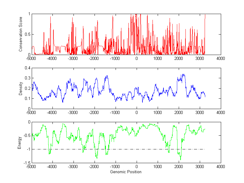 The energy profile (green curve) is about energy for module detection based on TF interaction. The positions with energy less than -1 indicate the existence of CRMs.