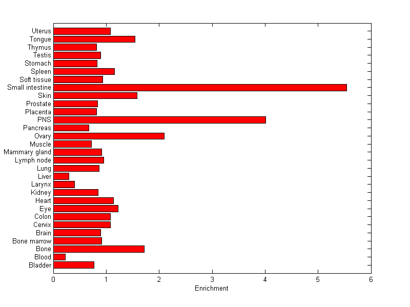 The expression level is normalized with tissue-library size. Each value for a gene in a tissue is a ratio of observed ESTs to the expected one in this tissue. The expected number of ESTs is the product of total ESTs of the gene and the fraction of total ESTs in the tissue among all ESTs in 30 tissues.