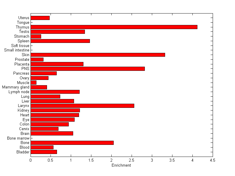 The expression level is normalized with tissue-library size. Each value for a gene in a tissue is a ratio of observed ESTs to the expected one in this tissue. The expected number of ESTs is the product of total ESTs of the gene and the fraction of total ESTs in the tissue among all ESTs in 30 tissues.