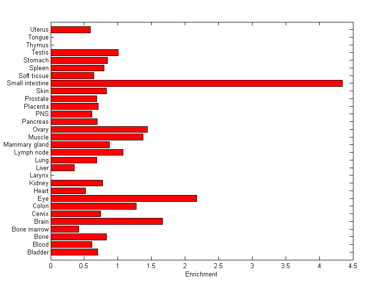 The expression level is normalized with tissue-library size. Each value for a gene in a tissue is a ratio of observed ESTs to the expected one in this tissue. The expected number of ESTs is the product of total ESTs of the gene and the fraction of total ESTs in the tissue among all ESTs in 30 tissues.
